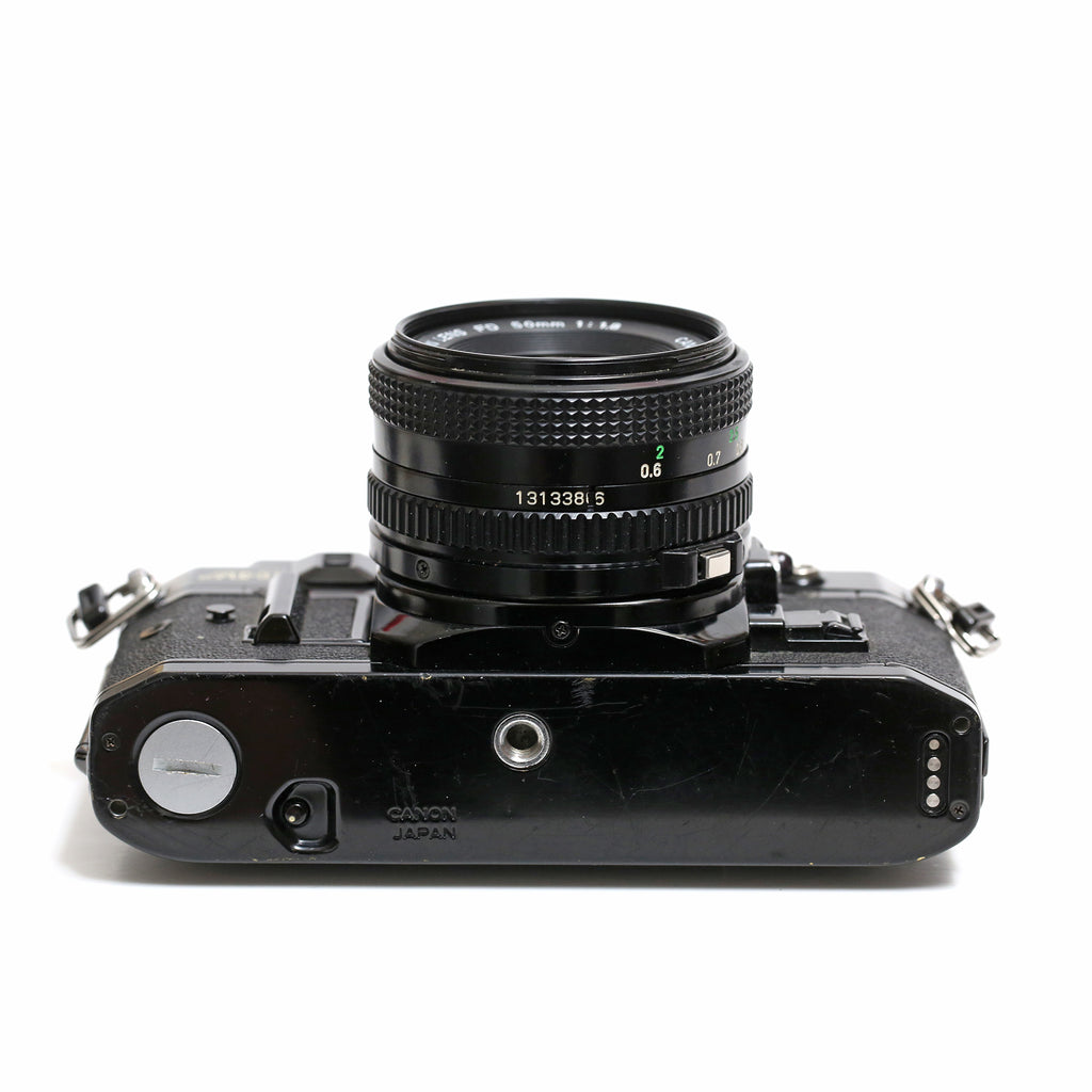 The popular Canon A-1 which has all the different exposure options, program auto (fully automatic), aperture auto, aperture auto and manual settings. Good condition and fresh light seal. The small grip on the front is missing.
