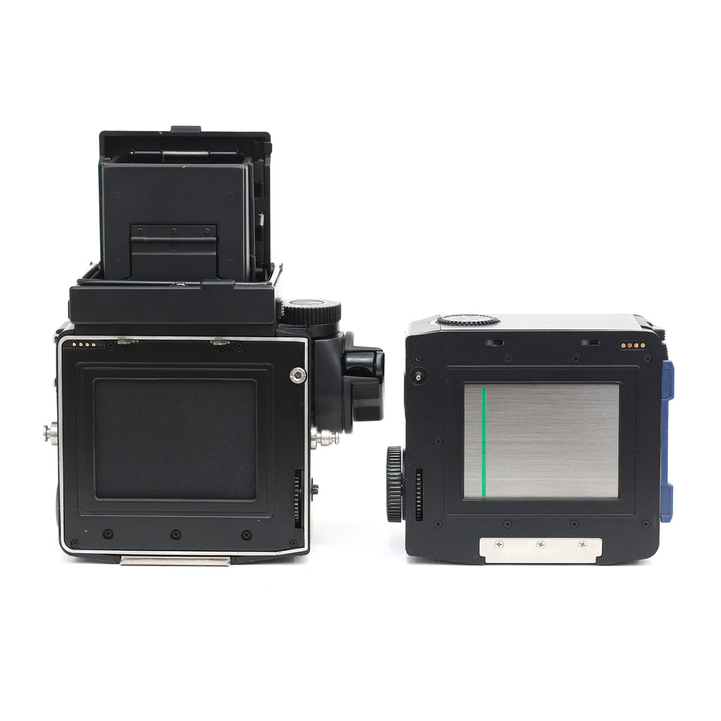 The camera is in super fine cosmetic condition, almost without any marks at all (there are some marks on the matte screen). The camera has a waist level viewfinder. Includes a film magazine with 120 insert. The lens has fine glass without fungus or haze. The focusing is on the lighter side. The matte screen also has markings for 35 mm film (there are such magazines for this camera).