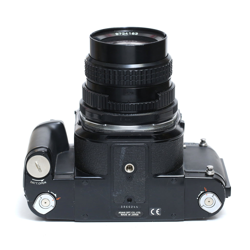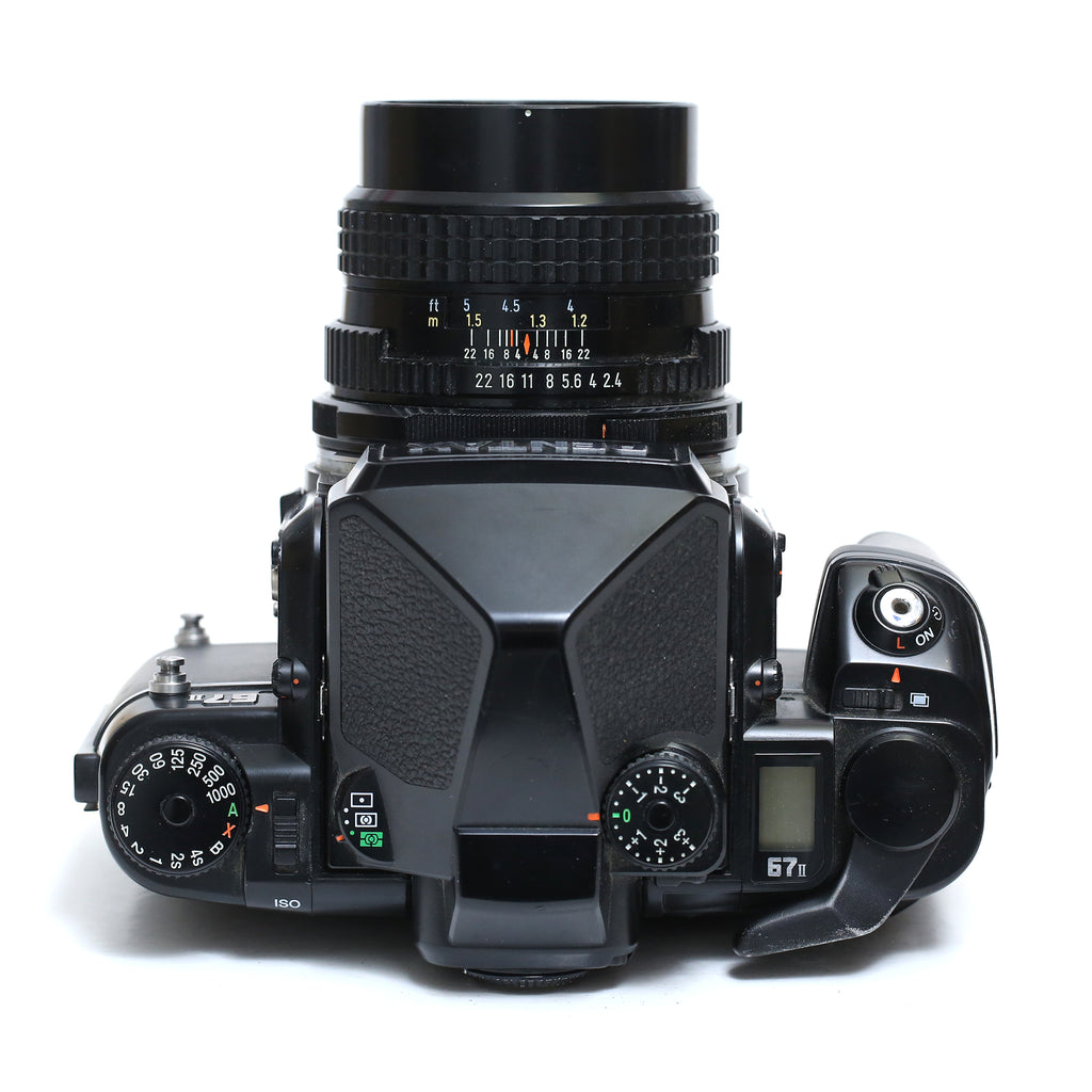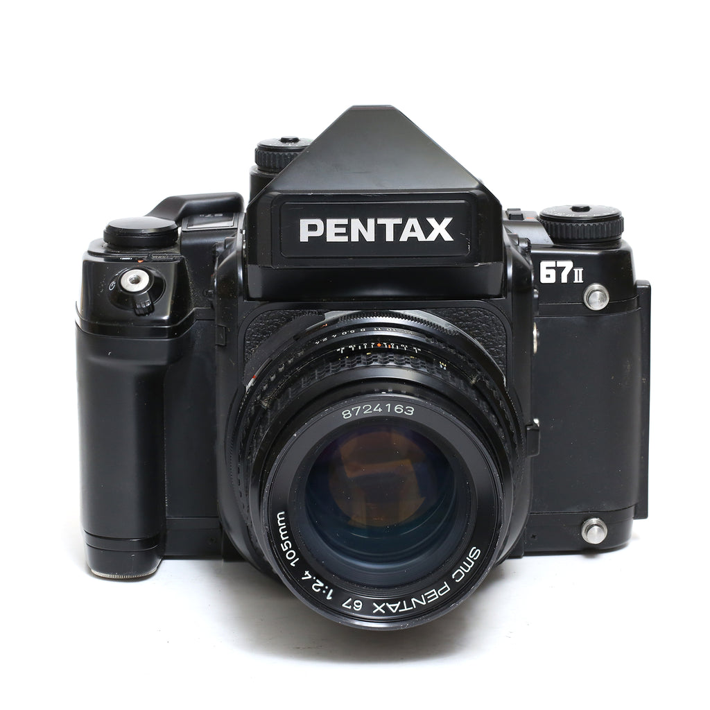 Mycket fin Pentax 67II + en lika fin SMC Pentax 105mm f2.4, med fina glas, mjuk och fin fokusering, rena bländarlameller. Kameran har ett okularglas på sökaren från en vanlig Pentax 67, men påverkar naturligtvis inte på något sätt.
