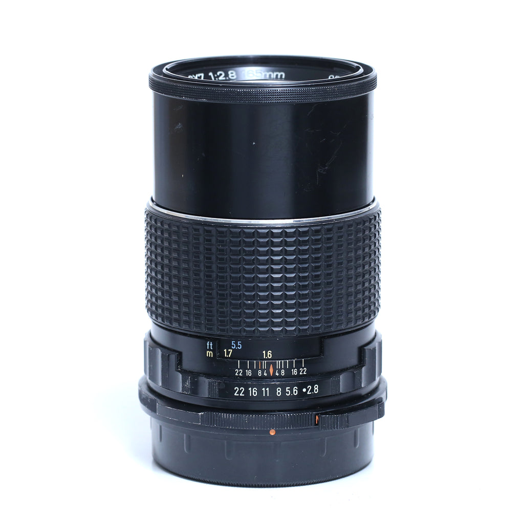 165mm till Pentax 67 i bra skick. Motsvarar 82,5mm i småbild.Inbyggt motljusskydd. Ingår bakre och främre lock.