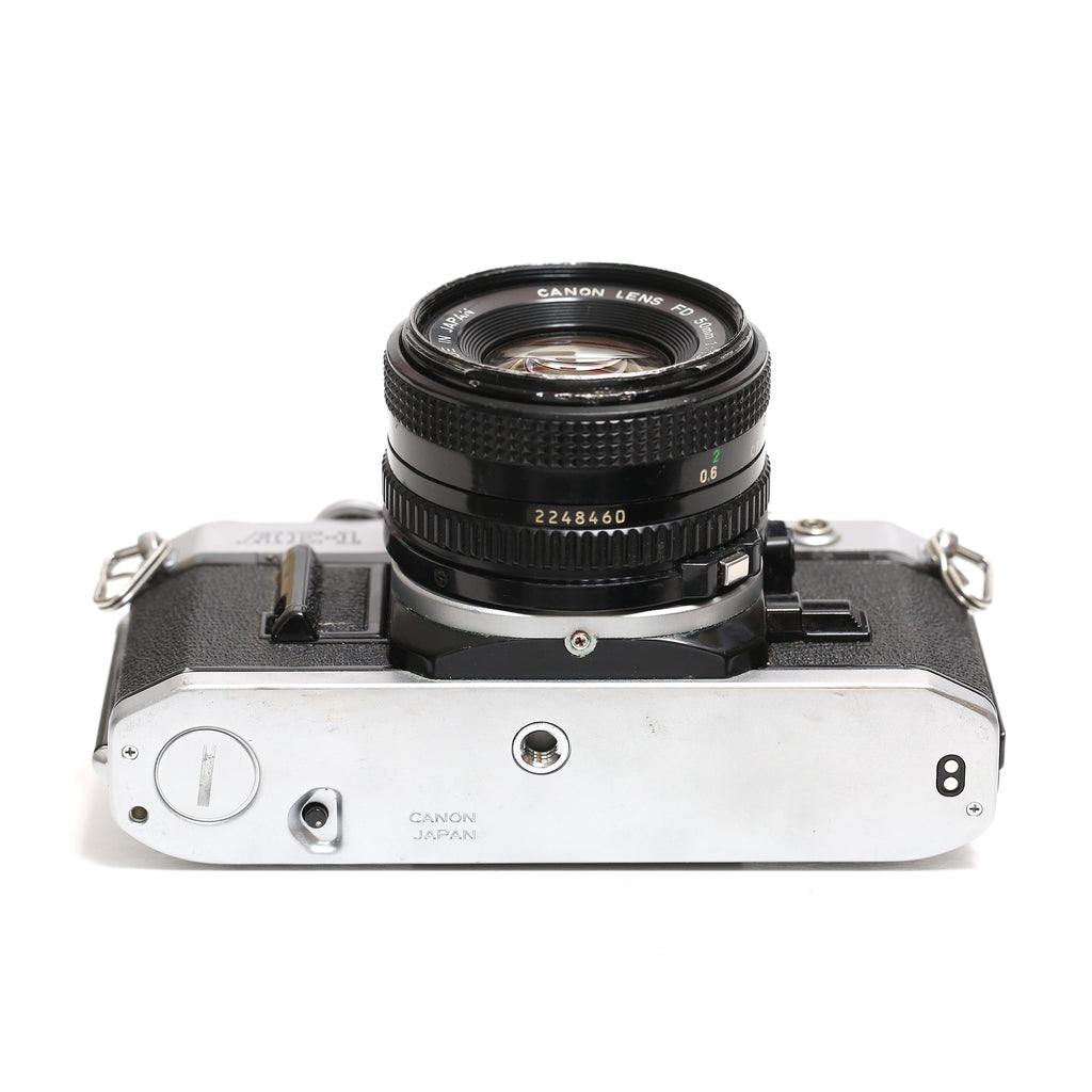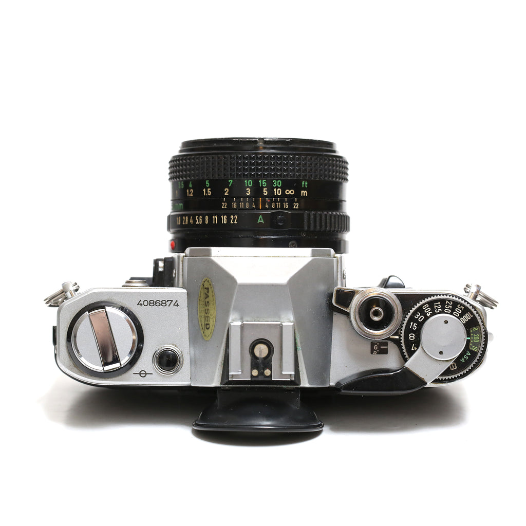 Klassisk kamera från Canon. Kameran har bländarautomatik eller manuell inställning.Objektivet har lite slitage på frontringen/filtergängan, men det går ändå att sätta på ett filter. Kameran är i fint skick.