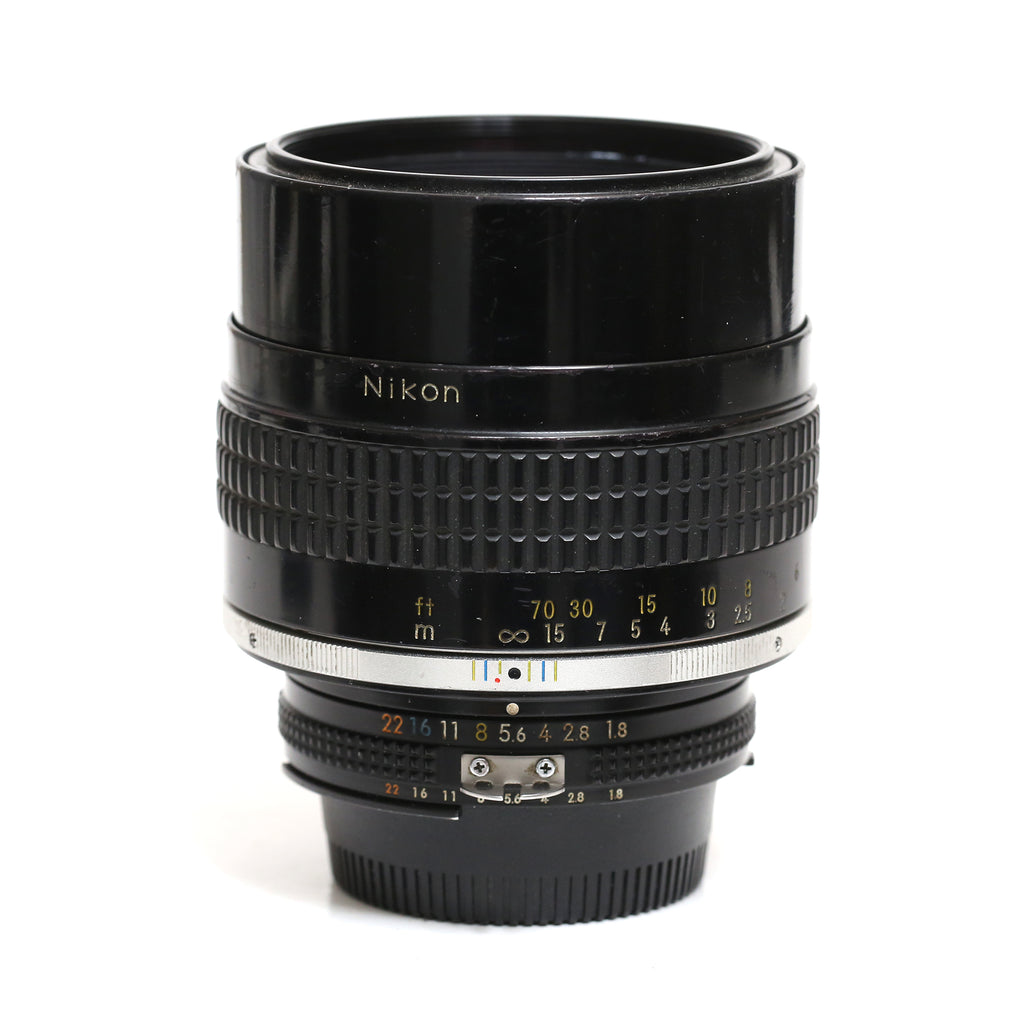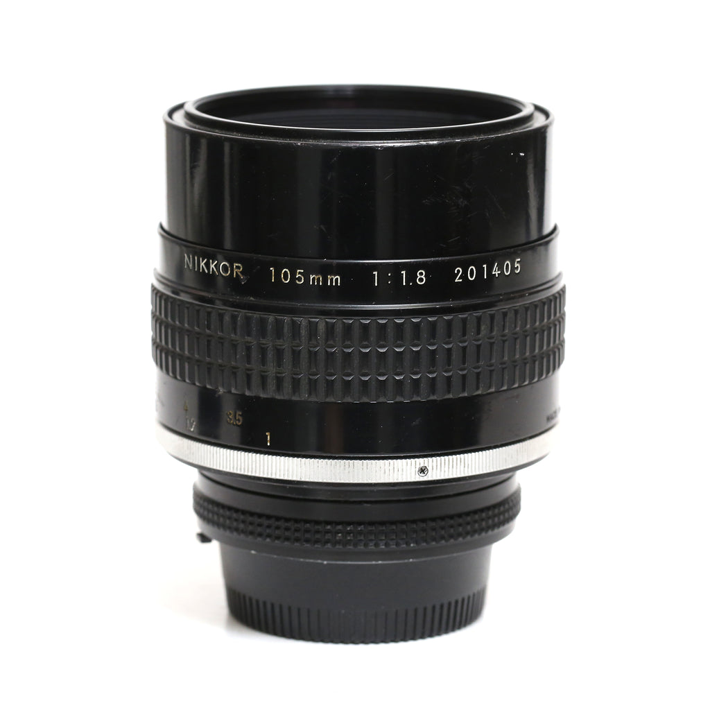 Fin Ljusstark Nikkor 105mm f1.8 Ai-s. Fina glas, helt rena bländarlameller, fokuseringen löper fint. Inbyggt motljusskydd. Ingår 2 st lock.