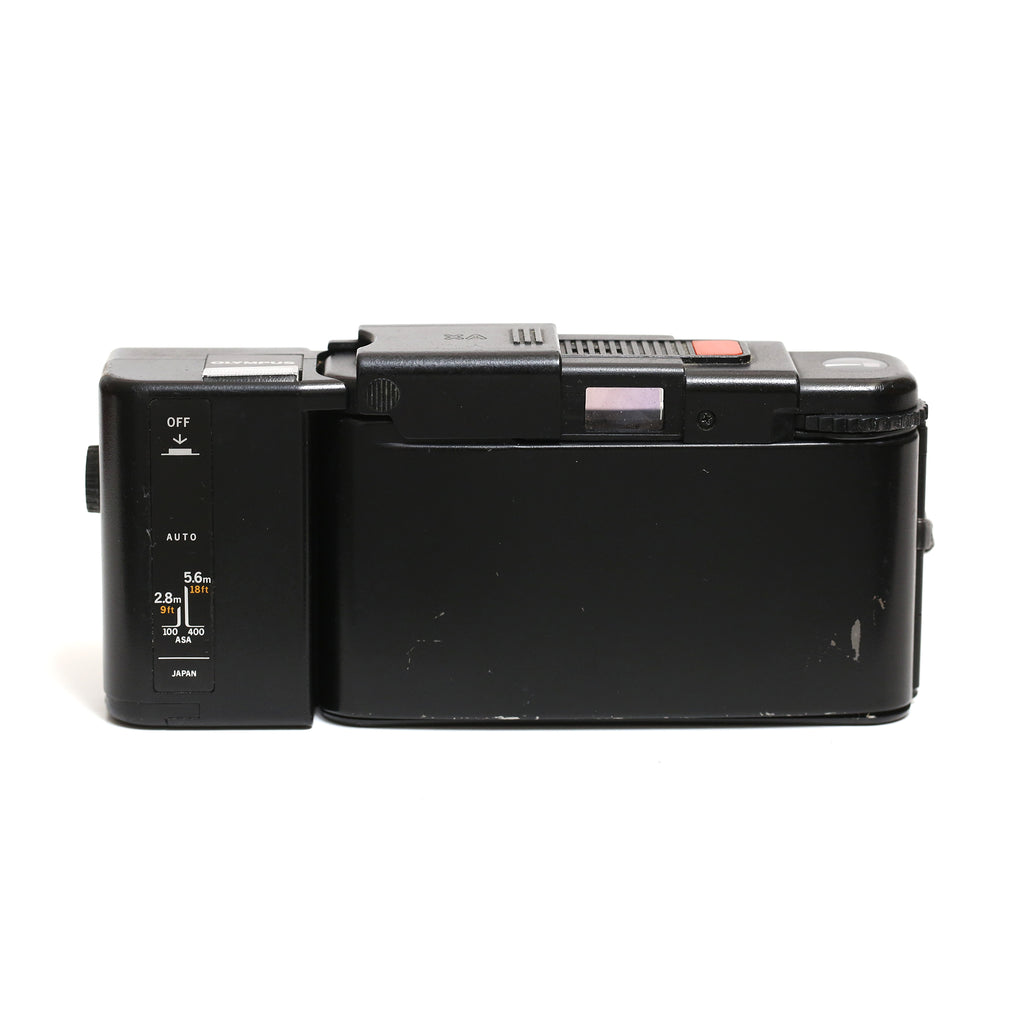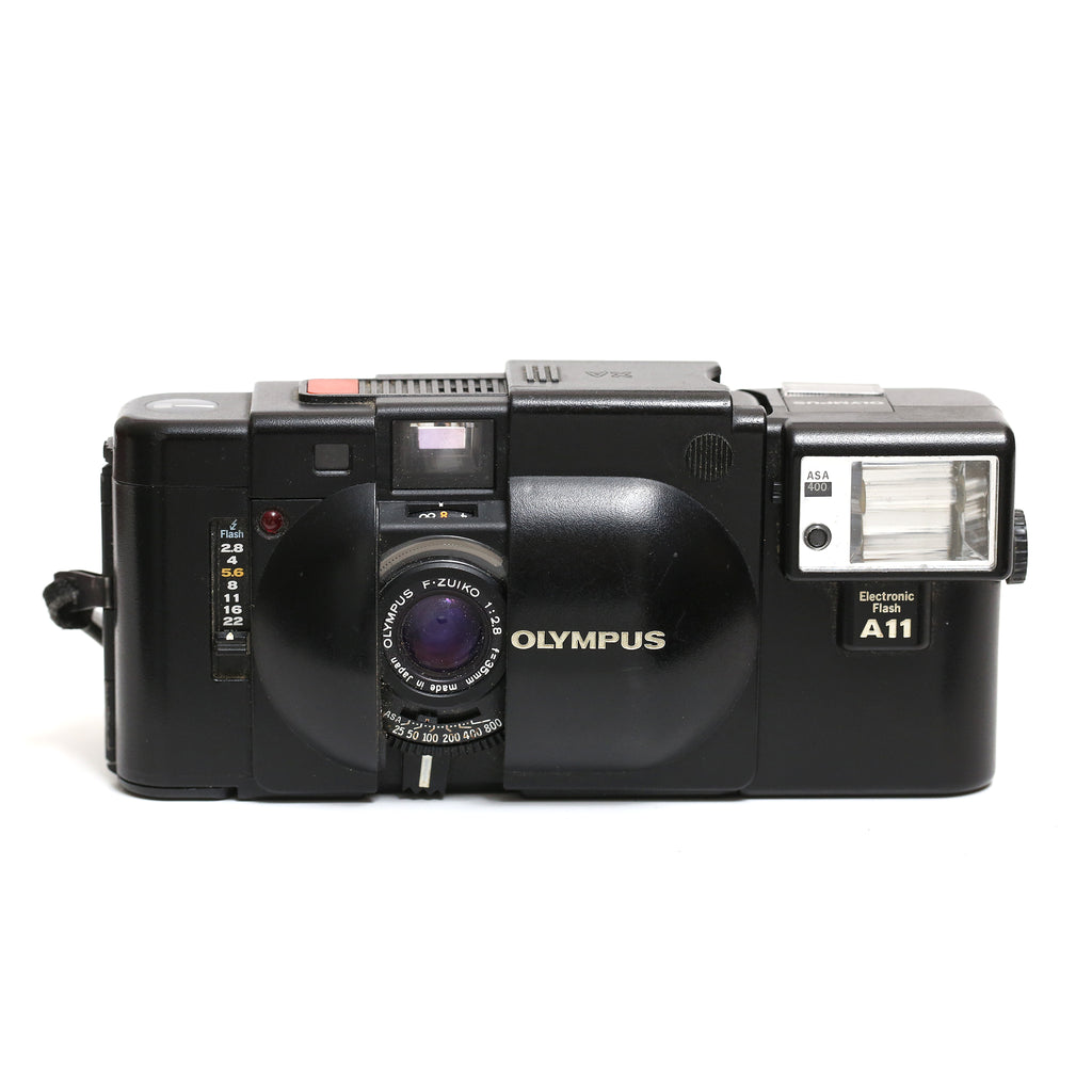 Fint skick på denna Olympus XA med A11 blixten (se bilder för egen bedömning).Kamera har tidsautomatik med bländarförval, manuell fokus. Skarpt 35mm f2.8 objektiv. Det följer med ett fint fodral i vinrött.